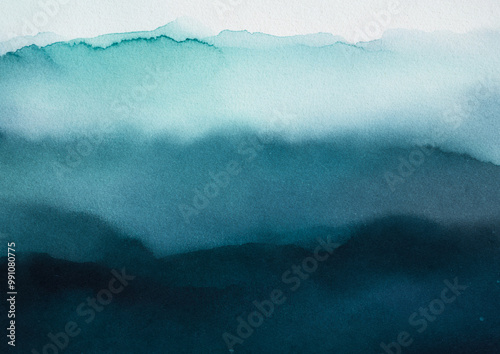 Abstract Watercolor Landscape with Layered Green and Blue Gradient Hills