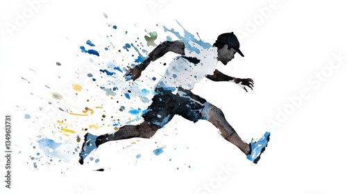 running, man, athlete, sport, abstract, watercolor, painting, movement, dynamic, energy, blue, white, colours, figure, athletic, action, speed, competition, fitness, healthy, lifestyle, jump, leap, motion, blur, splash, artistic, creative, illustration, design, graphic, digital, art, modern, contemporary, active, powerful, determined, strive, success, victory