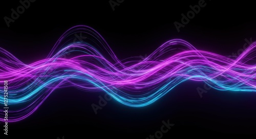 abstract waves, neon colors, electric energy, flowing lines, vibrant purple and blue, black background, dynamic motion, glowing light trails, digital art, futuristic, ethereal, sound visualization, co