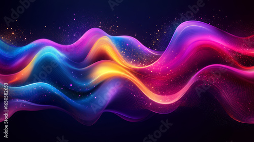 abstract, wave, colourful, vibrant, shimmering, particle, fluid, dynamic, flow, neon, gradient, colours, line, texture, design, art, digital, graphic, modern, smooth, movement, energy, pattern, style, geometric, illustration, bright, technology, glow, light, dark, background, artistic, composition, motion