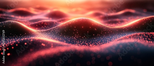abstract, wavy, terrain, particle, glowing, red, dark, digital, fractal, sunrise, sunset, landscape, hill, mountain, dynamic, fluid, motion, texture, science, technology, futuristic, cosmic, energy, light, glow, dot, speckle, vibrant, colourful, warm, crimson, blood-red, orange, background, pattern, design, three-dimensional, animation, illustration, surface, wave, digital artwork