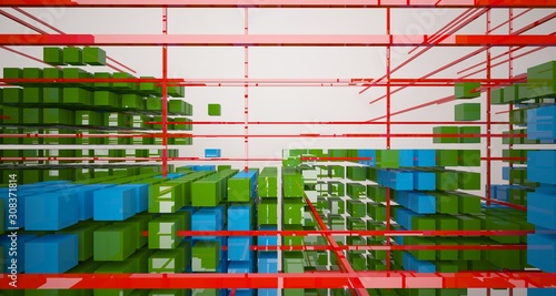Abstract white interior from array colored cubes with window. 3D illustration and rendering.