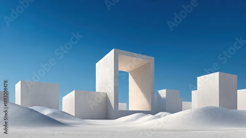 Abstract winter geometric architecture set with white cubes and portal frame in snowdrifts under clear blue sky, minimal background for modern design, branding, poster, presentation