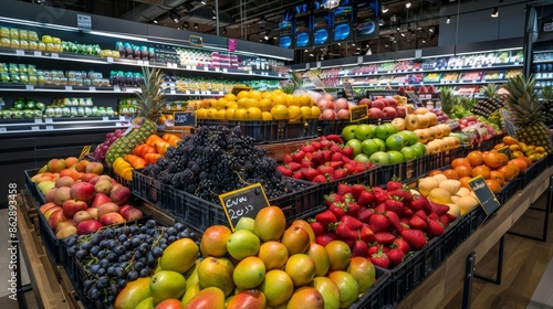 fruit, produce, grocery, store, display, fresh, mango, strawberry, apple, orange, grape, blackberry, pear, pineapple, colourful, vibrant, delicious, healthy, vitamin, market, food, shelf, retail, shopping, organic, natural, bright, green, red, yellow, orange, purple, crisp, ripe, juicy, sweet, tasty, abundance