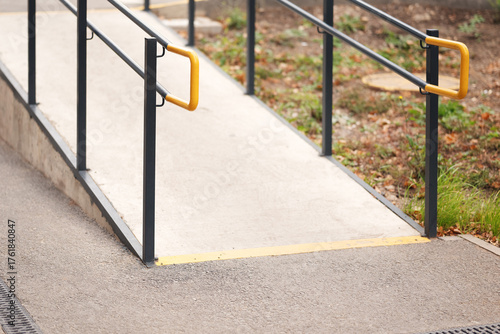 Accessibility ramp with yellow handrails on a city sidewalk, designed for people with disabilities and strollers.