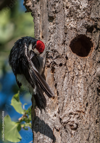 bird, preen, up high, animal, bathing, bird, black, california, cleaning, feather, forest, forested, groom, grooming, oak, perched, red, white, wildlife, timberland, woodpecker, wood