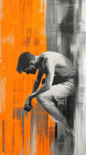 acrylic, painting, contemplative, man, orange, grey, texture, depth, introspection, emotion, art, vibrant, background, young, thought, artistic, creative, expressive, mood, modern, abstract, figure, solitude, pensive, design, visual, striking, contemporary, brushwork, dynamic, composition
