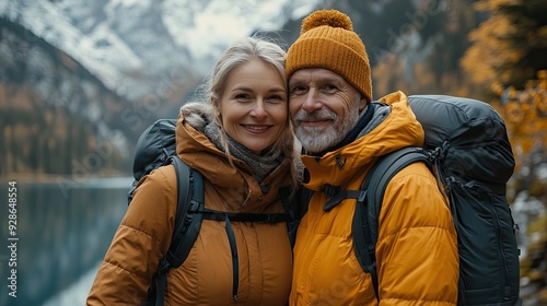 Active elderly couple enjoying a beautiful hike together in the autumn mountains, embracing each other in front of a lake as senior tourists.