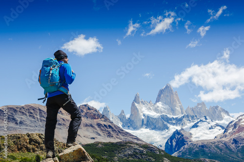 Active man hiking in the mountains. Patagonia, Mount Fitz Roy