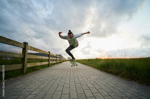 man, jump, stunt, hobby, skill, leisure, activity, freestyle, cool, male, practice, trick, paseo, pavement, active, motion, action, pathway, cloud, youth, dynamic, fence, casual attire, young, sporty, training, agile, adrenalin, cloudy, grass, sport, move, street, extreme, pastime, full body, full-length, surface level, blur, outdoors