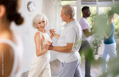Active mature men and women practicing Ballroom dances in training hall during dancing classes