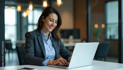 Active Middle-Aged Businesswoman Analyzing Digital Banking Trends on Laptop in Professional Office