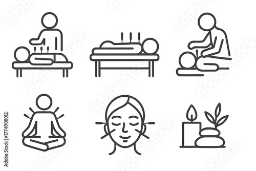 acupuncture, line, icon, style, session, patient, treatment, bed, healer, applying, needle, relaxation, pose, with, needle, calm, face, under, wellness, environment, icon, text, label, isolated, transparent, background