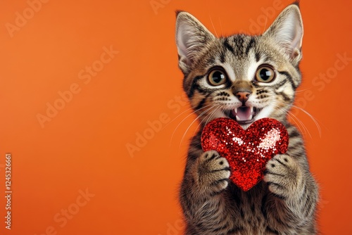 Ad campaign concept art. Egyptian mau - my cherished cat. Cute egyptian mau baby cat with sparkling rhinestones red heart - emblem of love, funny greeting card. Cute kitten february photo.