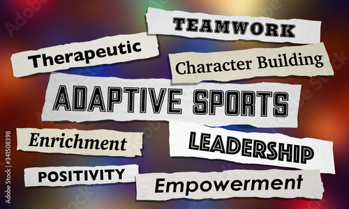 adaptive, sport, league, sporting, activity, compete, competition, wheelchair, access, accessible, disabled, disability, handicap, handicapped, athlete, athletic, news, headline, positive, attitude, play, playing, exercise, active, recreation, opportunity, therapy, therapeutic, teamwork, participate, participation, equal, equality, parity, fair, fairness, right, mobile, mobility, movement, accessibility, accommodate, accommodation, word, symbol, background, three-dimensional, illustration