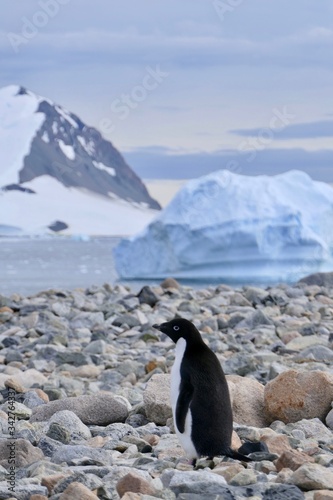 Adelie penguin in Antarctica on rocky beach with iceberg and mountain in background, at Stonington Islands