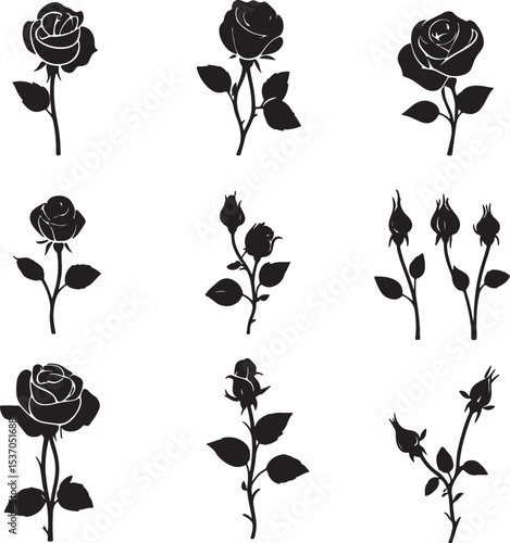 rose, collection, clean, simple, vector, silhouette, black, illustration, design, floral, plant, nature, art, outline, graphic, minimalist, icon, clip art, botanical, leaf, stem, blossom, monochrome, decorative, elegant, modern, aesthetic, vintage, beauty