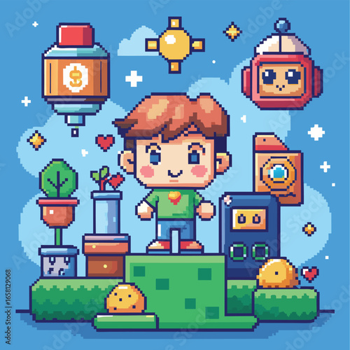 pixel, art, character, boy, cute, cartoon, gaming, retro, landscape, nature, tech, robot, camera, money, plant, pot, nubes, sun, cloud, sky, blue, green, digital, friendly, happy, design, game, adventure, fantasy, pixelated, illustration, element, science fiction, platform, level, modern, fun