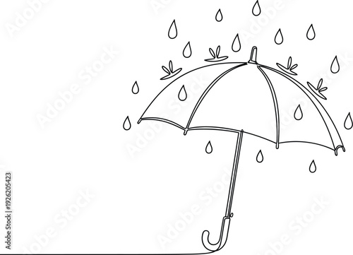 umbrella, rain, line, drawing, art, continuous, simple, minimalist, weather, protection, drop, water, vignetting, graphic, icon, symbol, element, design, contour, single, stroke, black, white, modern, abstract, illustration, concept, season, autumn, spring, rainy, droplet, outline, vector
