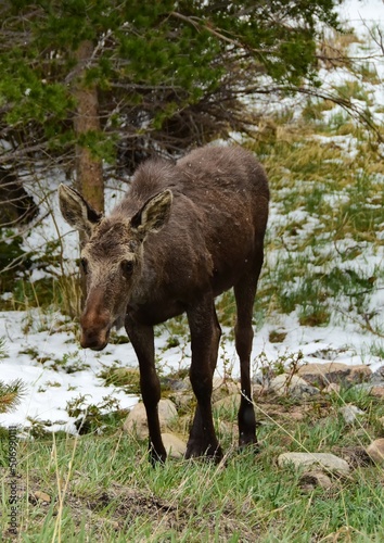 adolescent moose grazing in the willows during a late spring snowstorm in rocky mountain national park near estes park, colorado