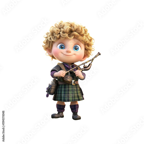 three-dimensional, render, toddler, children, baby, boy, children, cute, adorable, charming, scottish, scotland, bagpipe, pipe, kilt, plaid, plaid, music, musician, instrument, playful, happy, cheerful, joyful, smiling, fun, cartoon, animation, character, digital artwork, illustration, whimsical, festive, heritage, culture, tradition, celebration, holiday, young, innocent, sweet, blond, curly hair, blue eye, expression, posture