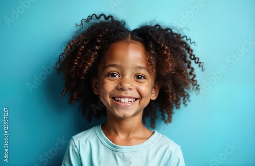Adorable African American girl displays cheerful smile against bright blue backdrop. Curly hair frames face. Looks happy, engaged. Photo captures pure childhood joy. Perfect for children book, school