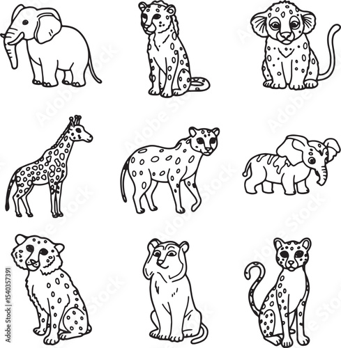 Adorable African Wildlife Line Art Drawings of Elephants, Giraffes, Leopards, and Cheetahs