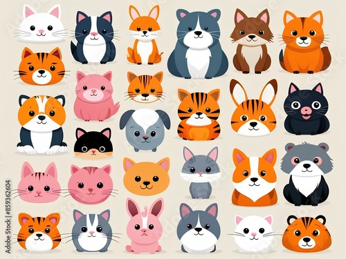 animal, cartoon, cat, dog, set, icon, vector, animal, head, baby, pet, pig, rabbit, face, bear, fox, illustration, tiger, collection, lion, cow, zoo, fun, panda, wild