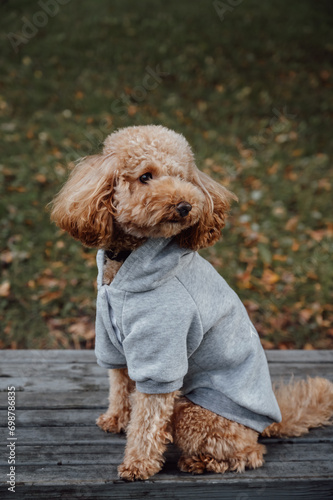 Adorable apricot toy poodle in hoodie sitting on the bench in the park looking at the camera.Concept of animal, fashion, dog's clothing, fun, humor, care, vet, style, ad