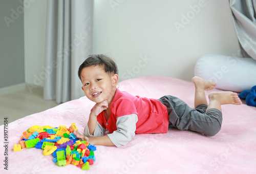 Adorable asian little baby boy playing colorful plastic blocks and lying on bed.