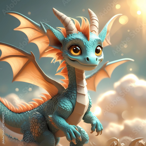 Adorable Baby Dragon Sitting on Clouds – Fantasy AI-Generated 3D Illustration