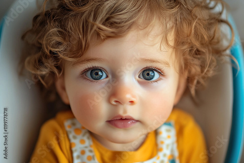 Adorable Baby Eating his her first food in Highchair, Generative AI artwork
