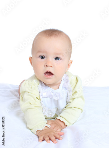 Adorable baby girl in cute clothes on blanket