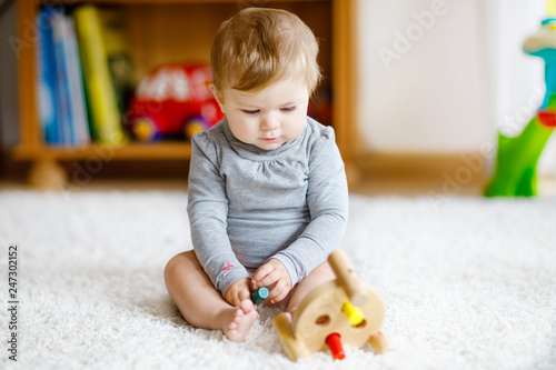 Adorable baby girl playing with educational toys . Happy healthy child having fun with colorful different wooden toy at home. Early development for children with nature toy.