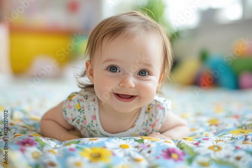 Adorable Baby Girl Smiles Joyfully on a Floral Blanket