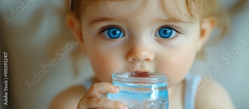 Adorable baby girl with big blue eyes drinking water from a glass.