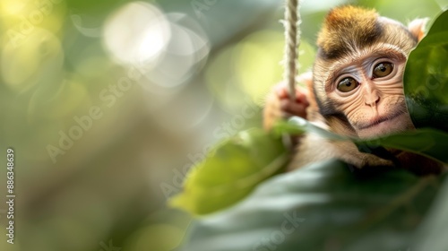 Adorable baby monkey clings to a rope amidst lush green leaves in a jungle setting with blurred background bokeh effect.