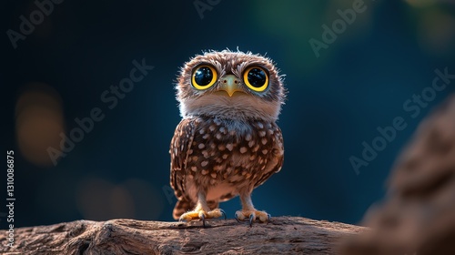 Adorable baby owl with large eyes perched on wood.