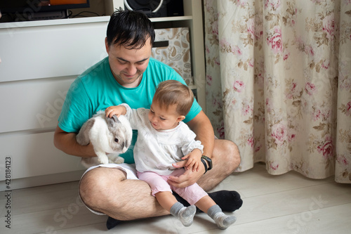 adorable baby sits in dad's arms and strokes a decorative rabbit. domestic animals in a family with children. father shows little child easter bunny