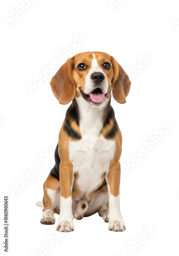 Adorable beagle dog sitting with tongue out, happy and friendly expression, isolated on transparent background