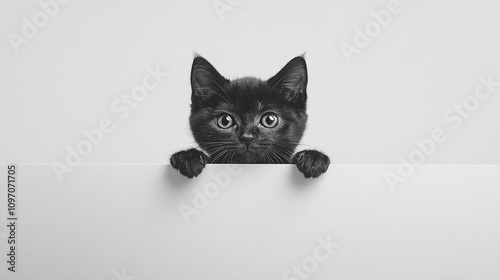 Adorable black kitten peeking behind white background, large eyes reflecting light