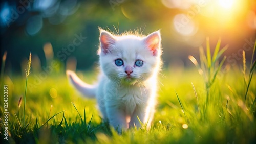 Adorable Blue-Eyed White Kitten Walking on Green Grass - Cute Pet Stock Photo