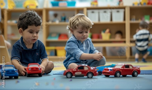 Adorable boys sitting on floor playing with car toys at kindergarten, Generative AI