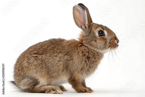 Adorable brown rabbit with long ears and shiny eyes, carefully posed against a white background for a photorealistic depiction