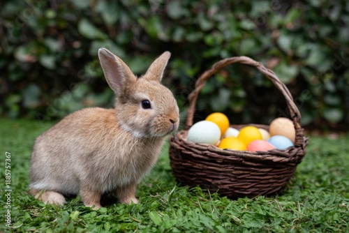 Adorable bunny with basket of colorful easter eggs on green grass