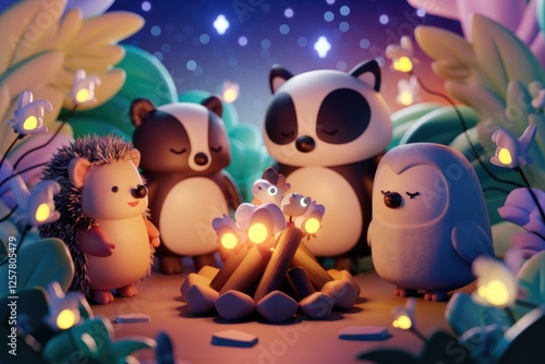 Adorable cartoon animals, hedgehog, badger, raccoon, and owl, gather around a campfire under a starry night sky.