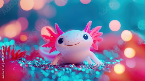 Adorable Cartoon Axolotl in Vibrant Pink and Teal Bokeh Lights