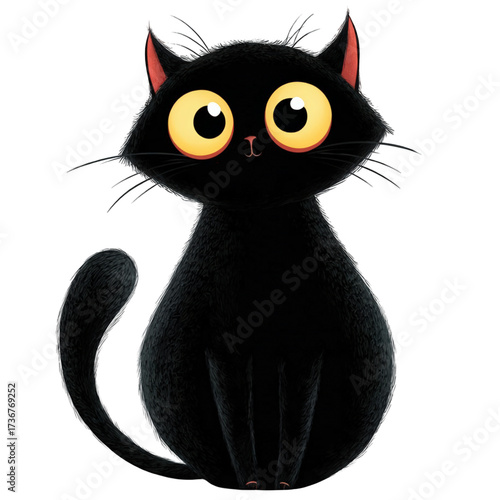 cat, kitten, black, felino, pet, animal, cartoon, illustration, cute, adorable, funny, character, design, art, drawing, graphic, isolated, white, eye, big, yellow, sitting, fluffy, furry, tail, whisker, ear, skittish, halloween, magic, sorcerer, mystical, simple, modern, stylised, icon, symbol, mascot, creature, domestic, mammal, companion, curious, gaze, stare, look, artistic, creative, vector