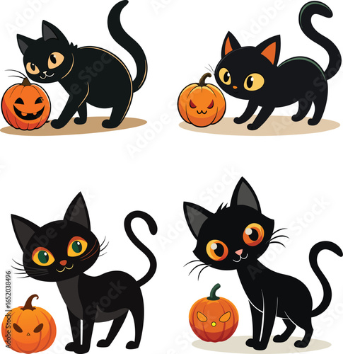 Adorable Cartoon Black Cats with Pumpkins Celebrating Halloween Perfect for Kids Illustration and Spooky Season Designs