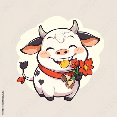 cow, cartoon, cute, happy, flower, adorable, animal, illustration, design, art, graphic, drawing, digital, artwork, image, character, whimsical, fun, joyful, cheerful, smiling, sweet, charming, delightful, pleasant, red, white, black, spot, tongue, floral, bouquet, gift, present, celebration, holiday, vector, clip art
